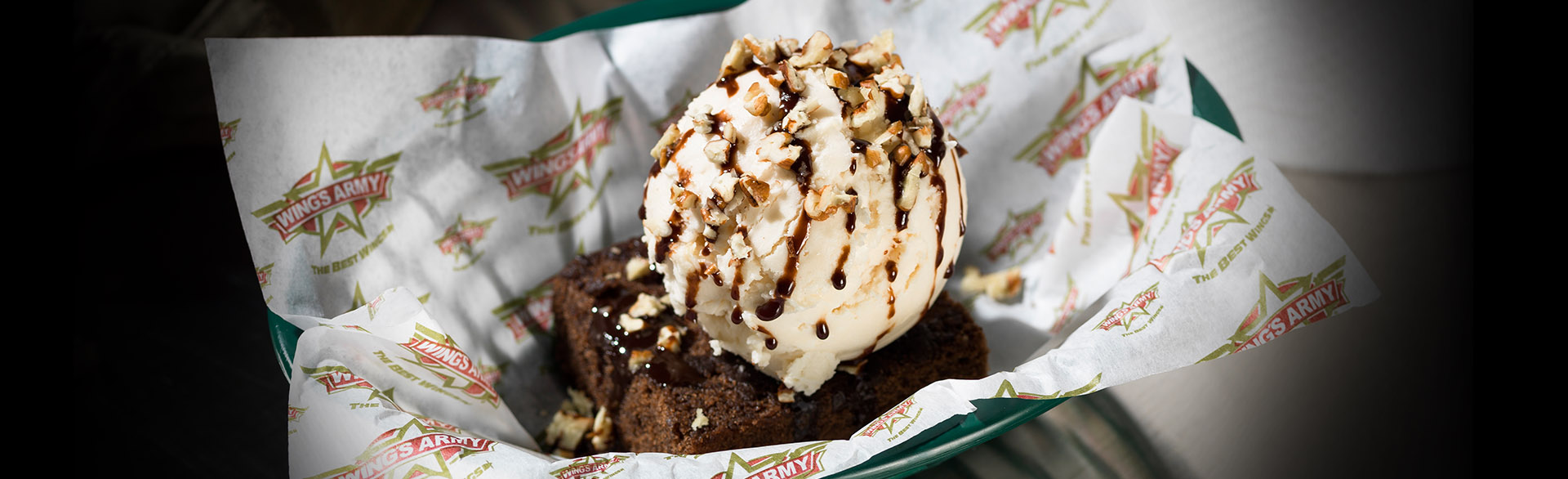 ¡Dulce victoria! Brownie de chocolate acompañado de una bola de helado de vainilla, bañados con jarabe de chocolate y espolvoreados con trocitos de nuez.