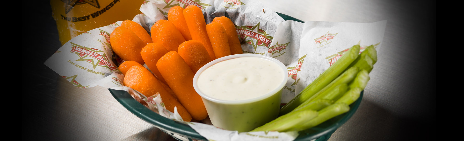 Para los que les gustan las opciones más saludables. 160g de zanahoria y apio acompañados de un sabroso dip de aderezo.