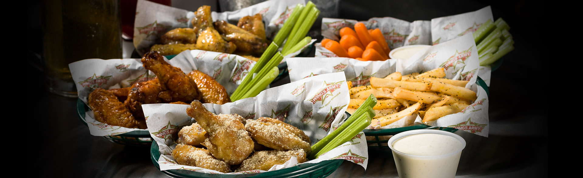 Municiones para una gran tropa. 30 deliciosas alitas con las salsas de tu elección + Papas a la francesa o aros de cebolla + 160g de vegetales + Dip grande