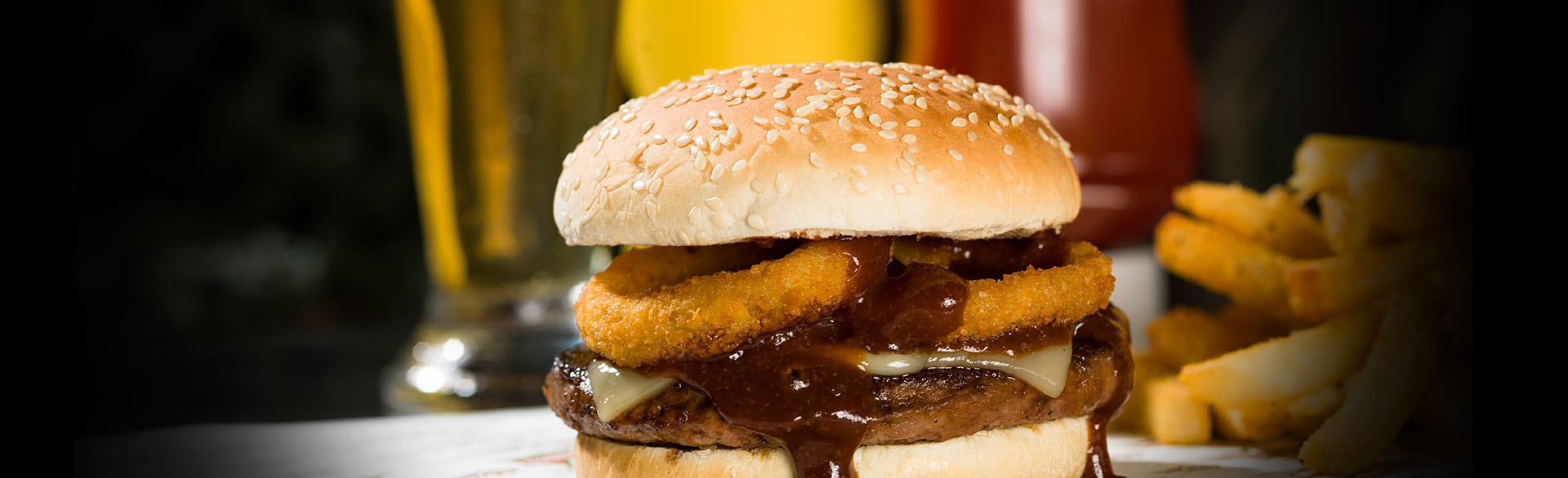 Carne de res, queso blanco, aros de cebolla, Ranch, y salsa ahumada.